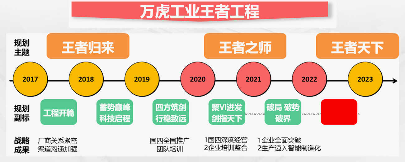 王者工程的打造將徹底突破現(xiàn)有萬虎工業(yè)發(fā)展格局,實現(xiàn)研發(fā)、制造、品質(zhì)、營銷、服務(wù)、價值鏈多重因素合一,為企業(yè)產(chǎn)業(yè)多元拓展和寡頭地位做準備。